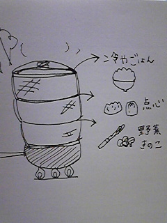 1段目:野菜 2段目:点心 3段目:冷ご飯(ある場合)